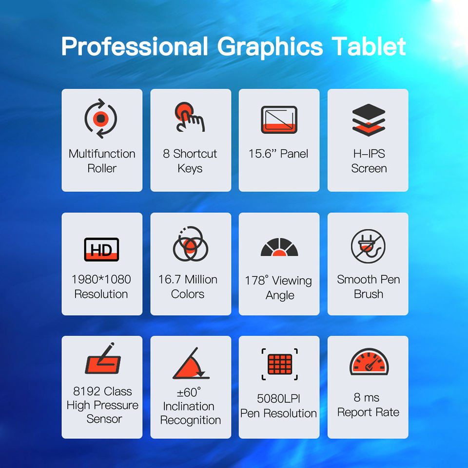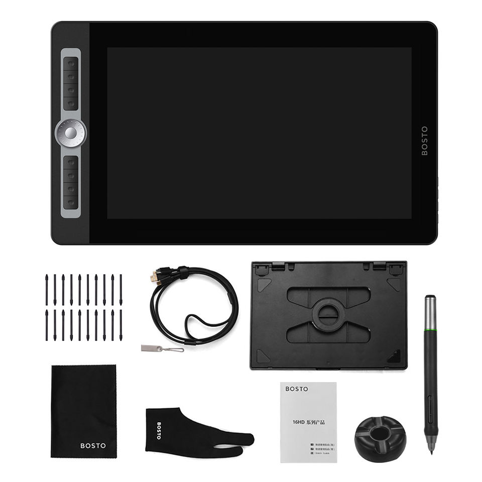 Tablette graphique BOSTO 16HD Pro 15,6 pouces avec écran LCD H-IPS, tablette de dessin numérique, 8192 niveaux de pression, stylet sans batterie