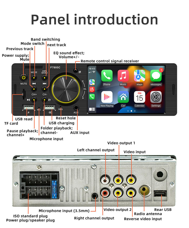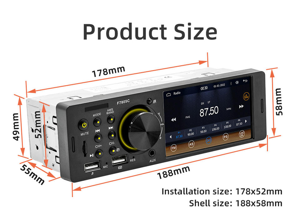 BQCC Autoradio 1 DIN MP5 4,1'' CD7388CZ/F7805C, Bluetooth 5,1, Android Auto/CarPlay filaires, 60W×4, 12–14,4V, 1 unité