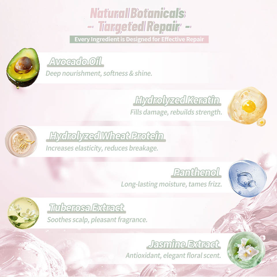 Kératine hydrolysée, Panthénol, Extrait de Polianthes Tuberosa, Extrait de fleur de jasmin, Huile d'avocat, Protéine de blé hydrolyséeIngrédient