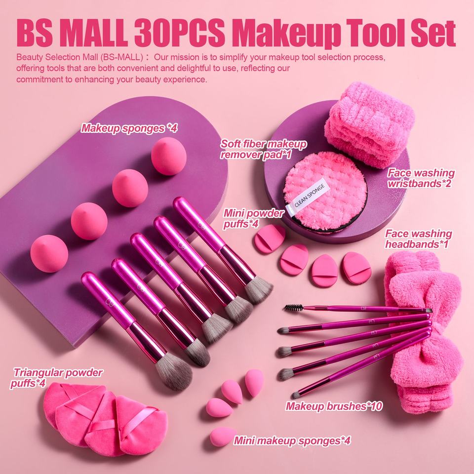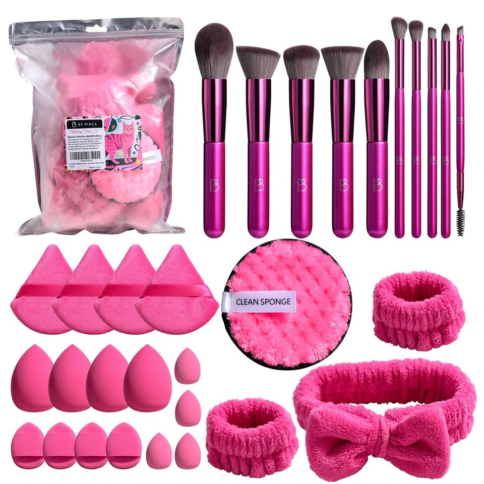 Ensemble de pinceaux de maquillage rouge BS-MALL pour femmes et filles, ensemble d'outils faciaux, bandeau de spa, poudre douce, éponge de maquillage, pinceaux cosmétiques