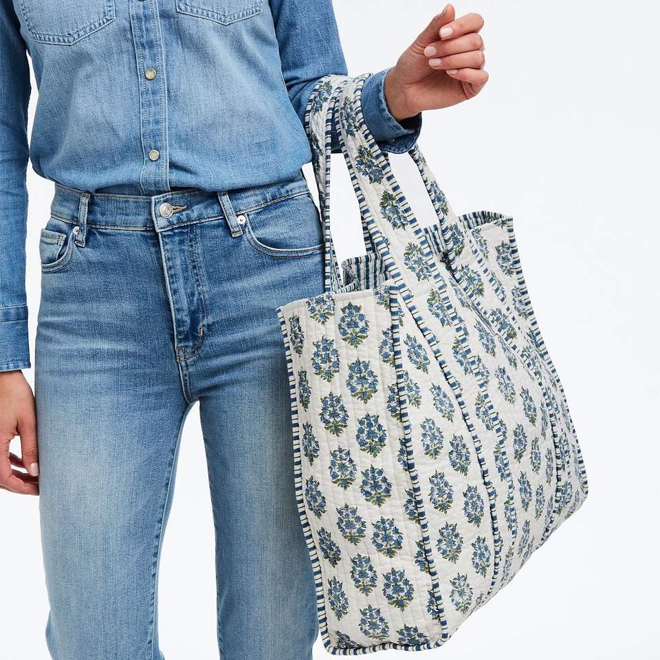 Sac fourre-tout en coton tendance de la collection BSCI OEM Block Print, sac de plage matelassé à fleurs, grand sac fourre-tout pour les nouvelles mamans