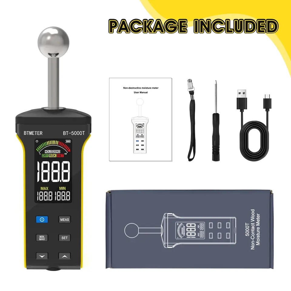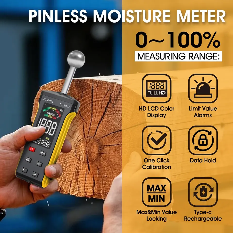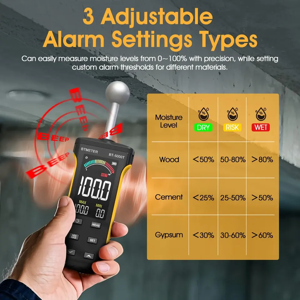 Détecteur d'humidité mural sans broche BT-5000T - Testeur d'humidité du bois 20-40 mm de profondeur Alarme humide/risque/sec Testeur de surface