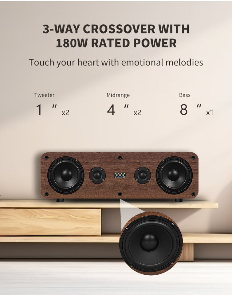 Haut-parleurs audio en bois actifs professionnels BT5.3 de 8 pouces 180W avec système audio Super Bass pour ordinateur et communication auxiliaire