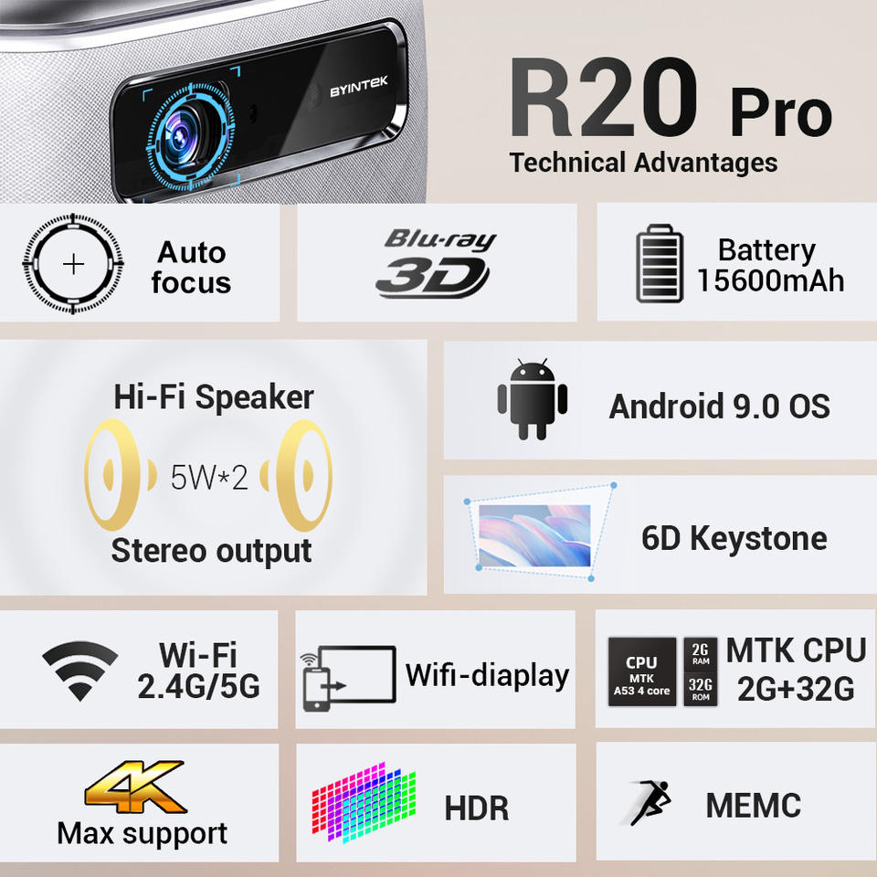 Projecteur BYINTEK R20pro DLP 4K 3D Android 9.0 2G 32G Haute luminosité Projecteur de jour Zoom 5GWifi BT Airplay Jeu vidéo Proyector