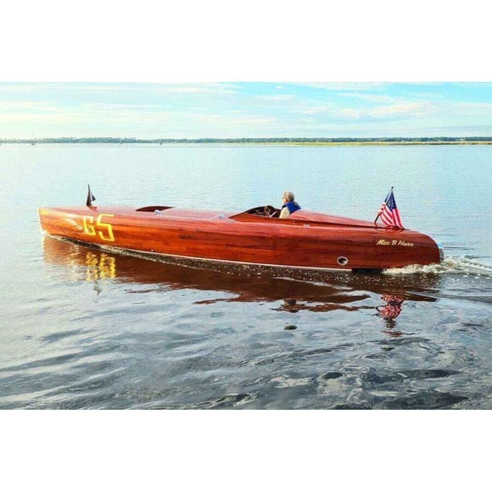 Modèle de bateau en bois de cèdre Baby Bootlegger, artisanal et peint, bateau rapide classique vintage, objet de collection pour présentation sur table
