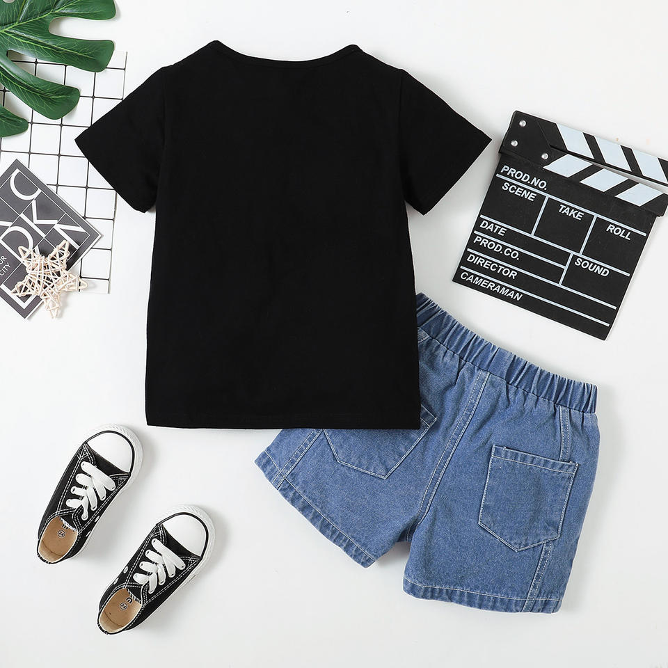Feature:Short sleeve, letter prints top, elastic denim shorts