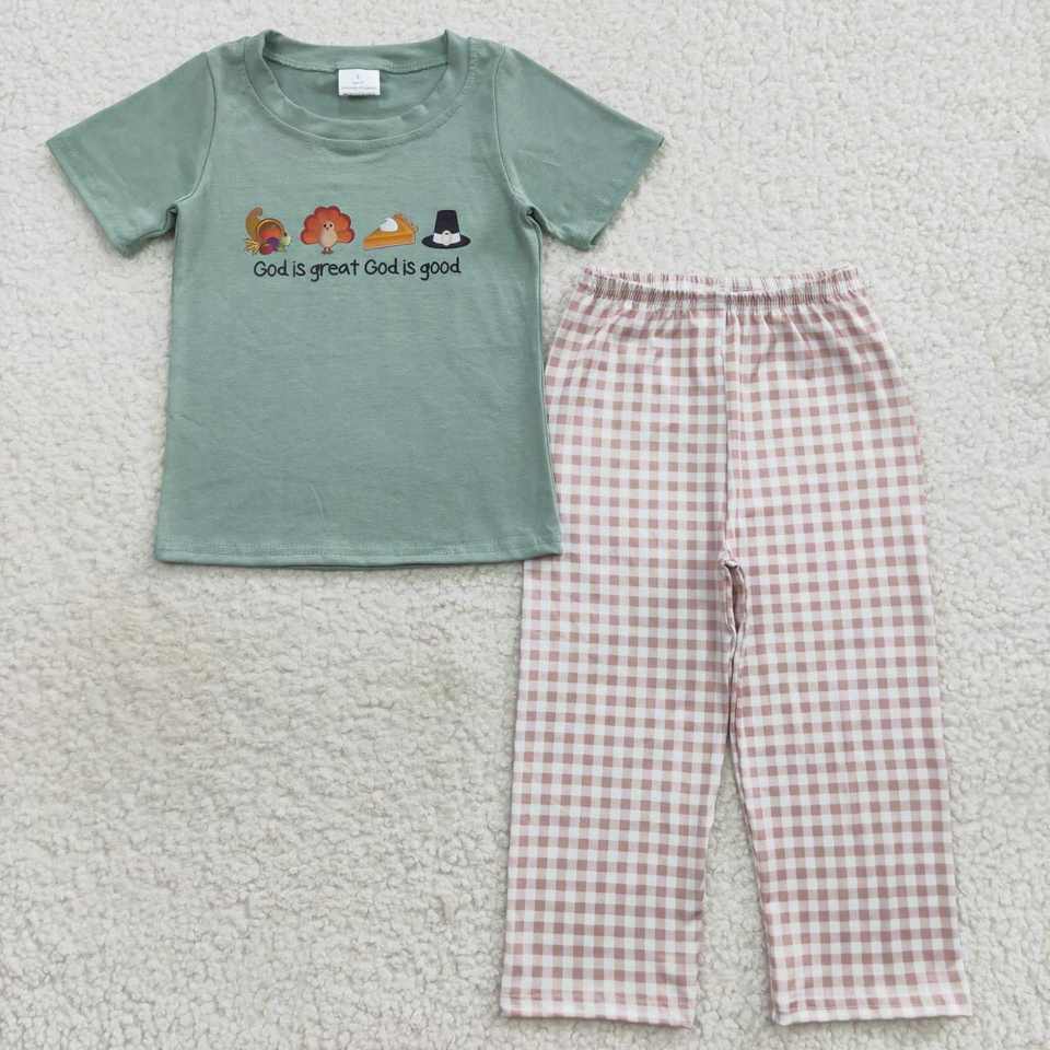 Baby Girls Boys Sibling Thanksgiving Casual Wholesale Clothing Ready Ship Turkey Short Sleeve Tunic Top Gingham Pants Outfit