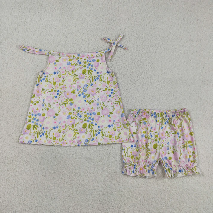 Ensemble de vêtements d'été pour bébés filles, tunique à bretelles avec fleurs, short à volants