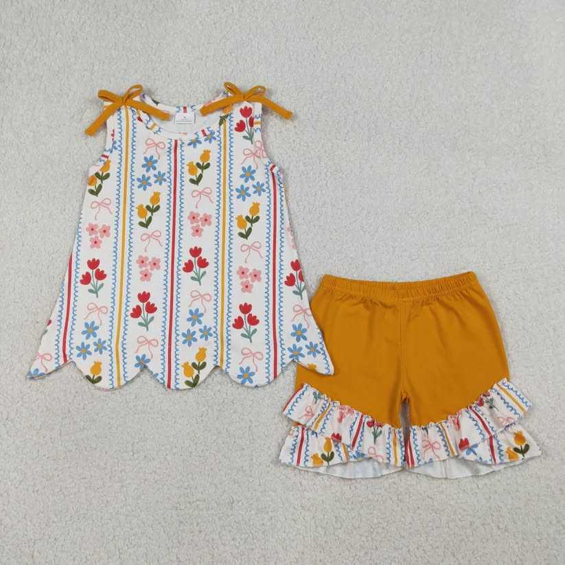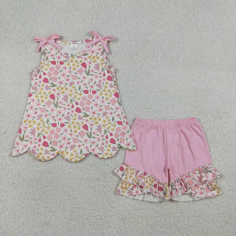 Tenue pour bébés filles en soie de lait à motifs cerises et nœuds avec short à volants en vichy