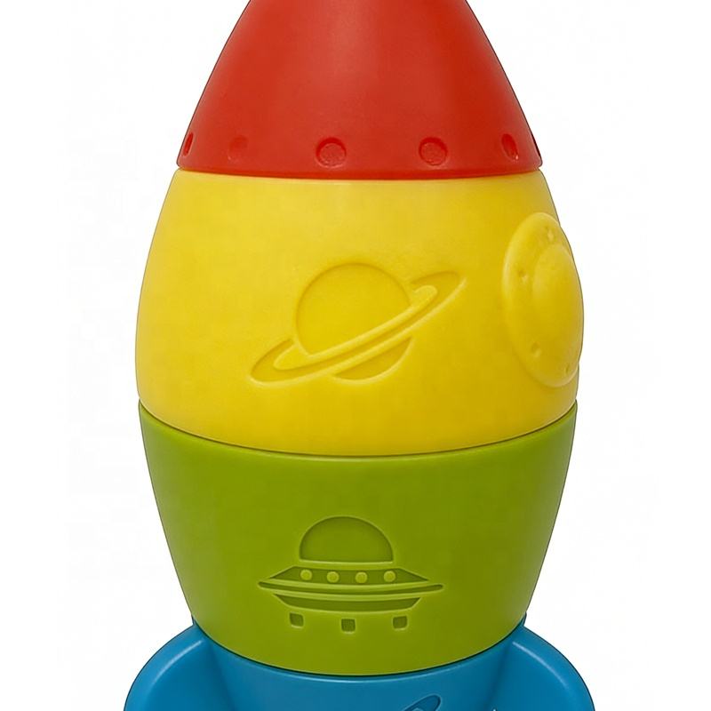 Ensemble de 4 pièces musicales empilables en caoutchouc souple coloré, non poreux, en forme de fusée.