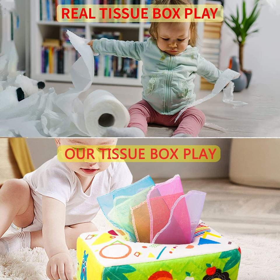 Jouet de boîte à mouchoirs pour bébé, jouets sensoriels pour bébé, boîte à mouchoirs magique avec papiers froissés et foulards en soie colorés, Montessori pour bébés