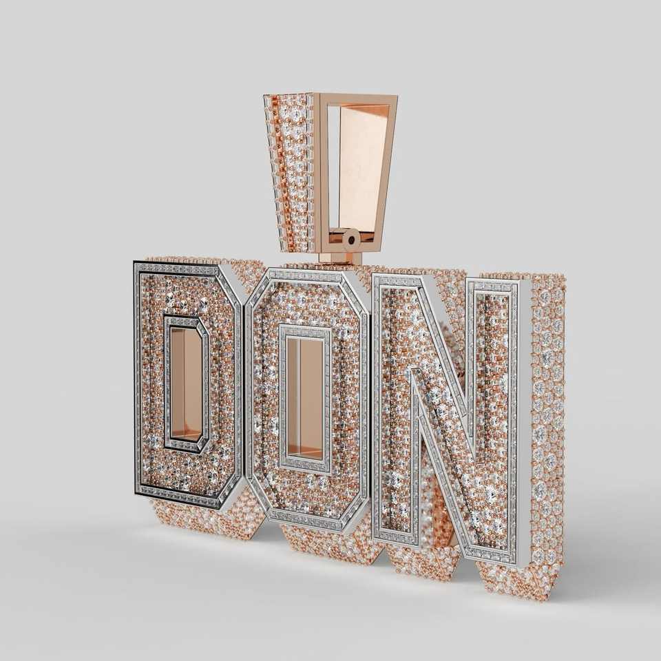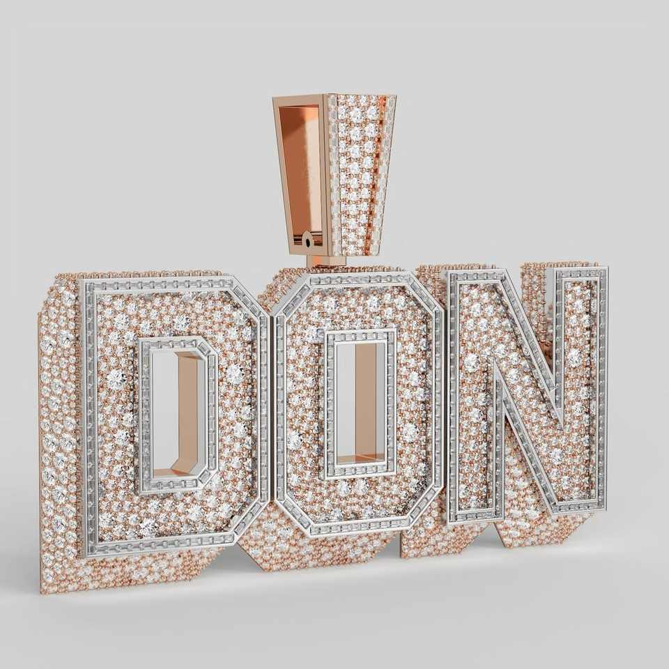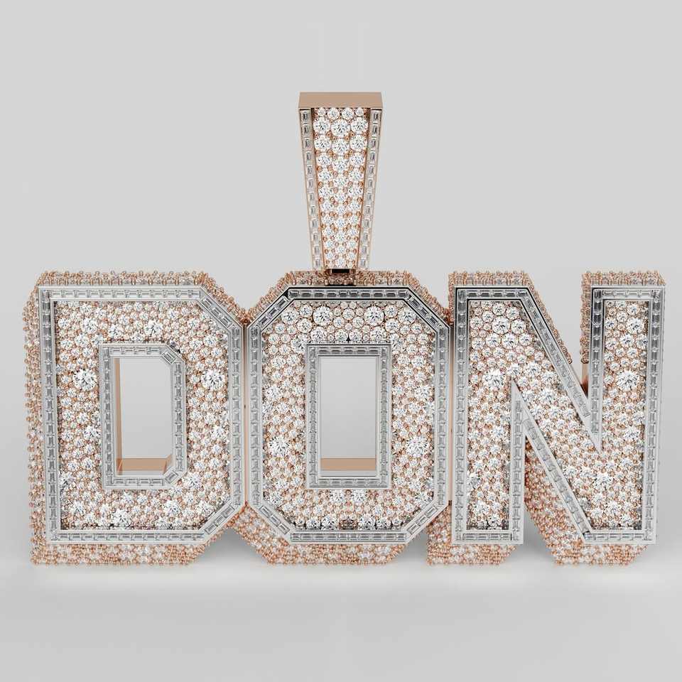 Pendentif vertical personnalisé en moissanite plaqué or rose, serti de 3 lettres en mosaïque, taille baguette et taille ronde