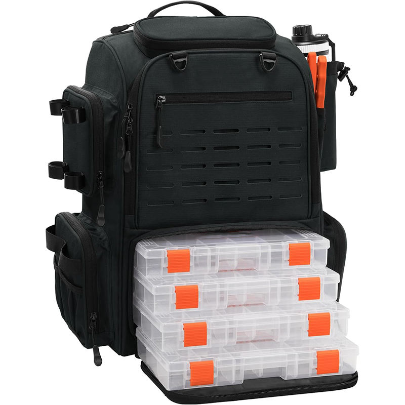 Bait Boss Pro Grand sac à dos de pêche 45L avec porte-canne et 4 boîtes de matériel de pêche Sac de rangement décontracté pour équipement de pêche