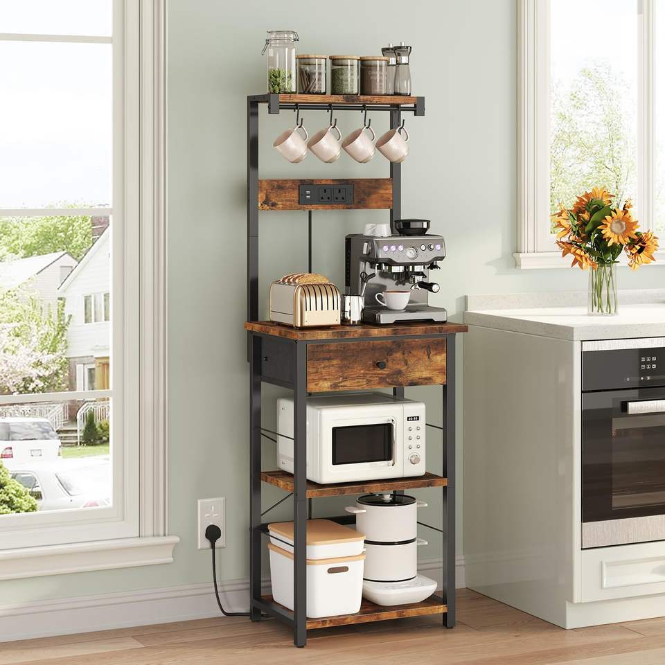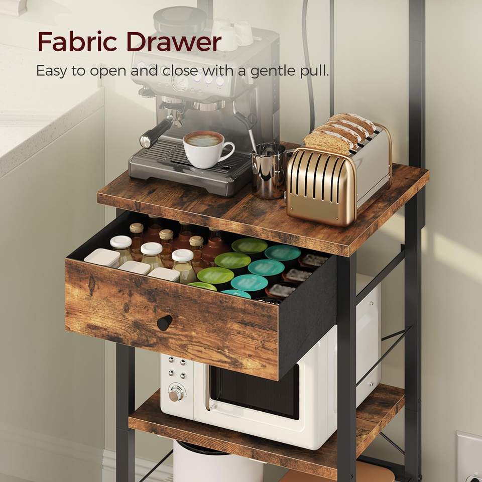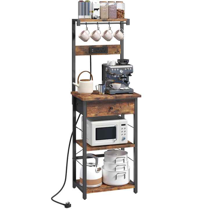 Étagère de cuisine multifonctionnelle avec support pour micro-ondes, station café, tiroir et multiprise intégrée