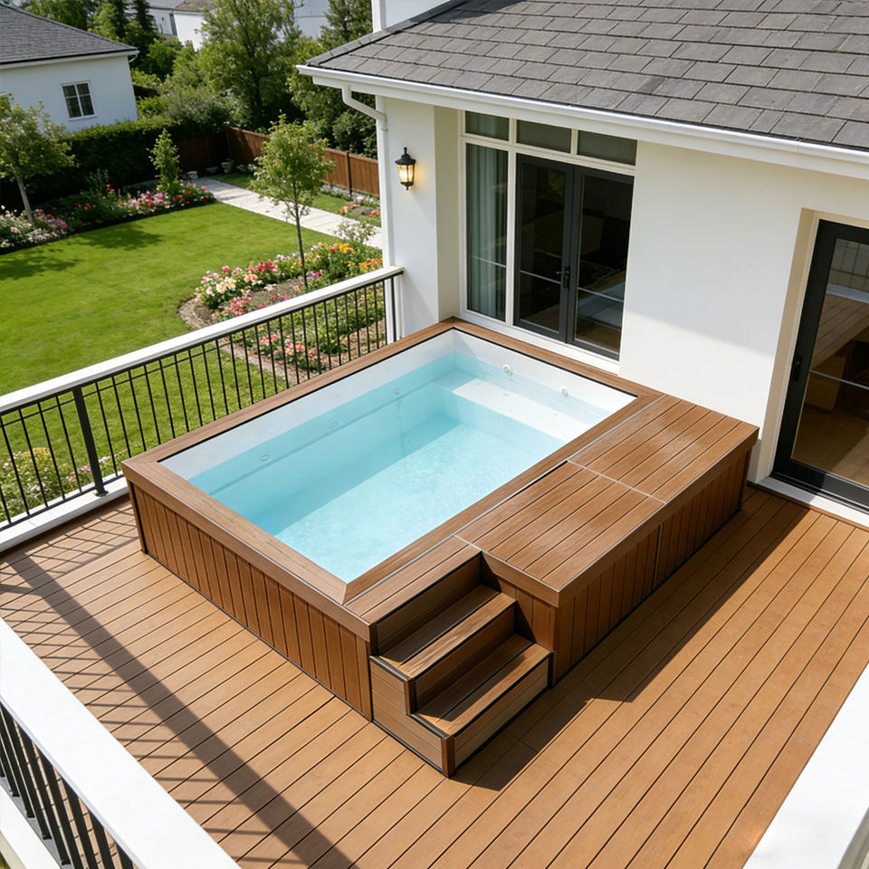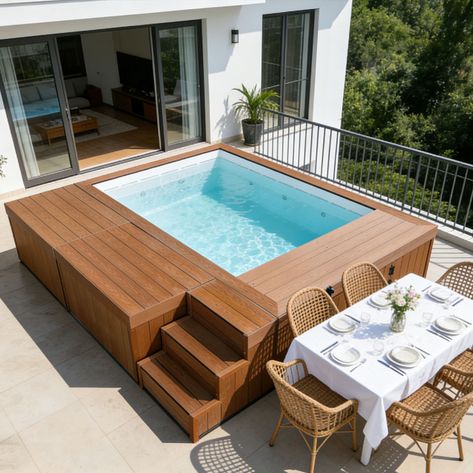 Piscine hors sol avec transat pour balcon, terrasse extérieure, petit jardin, en acrylique, avec couverture et échelle