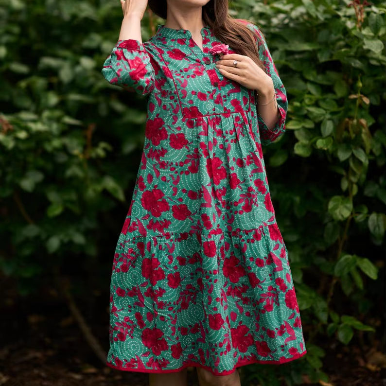 Bali Hand Block Printed Cotton Dress Bohemian Casual Occasional Floral Turquoise Pink Pure Cotton Handcrafted