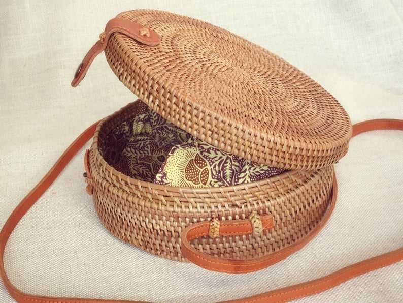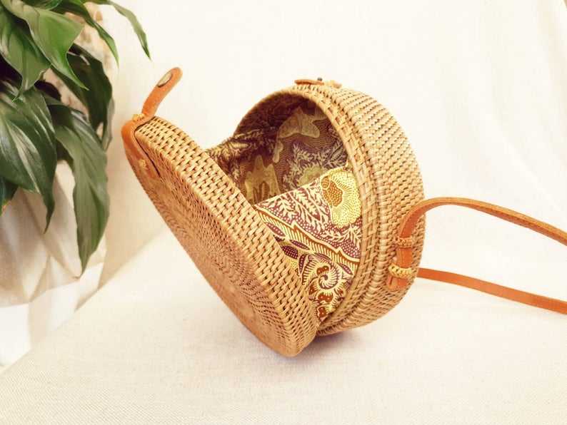 Sac en rotin rond Bali paille tissée à la main avec broderie écologique perles et nœud décor sac tissé en rotin
