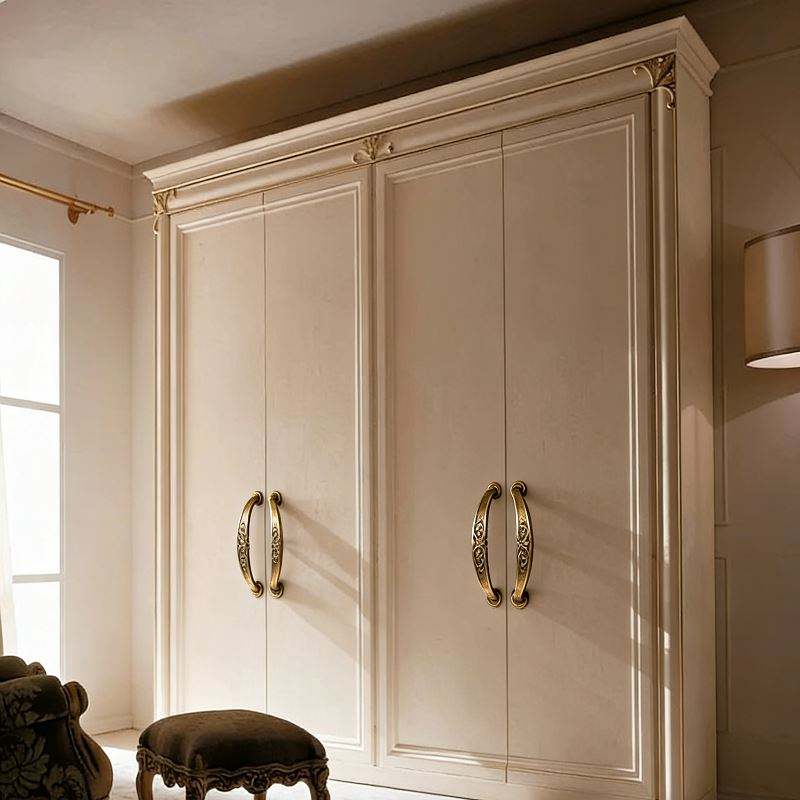 Armoire à quatre portes Balom, style palais français, luxe léger, finition blanc crème, détails dorés et poignées en métal