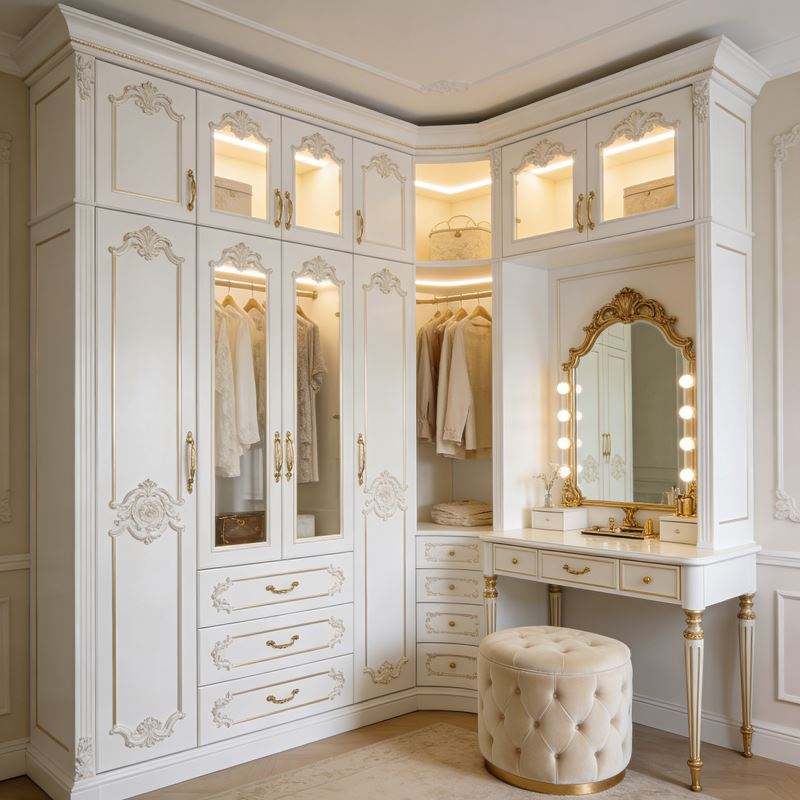 Balom Armoire sur mesure de luxe moderne en forme de L Style français Armoire intégrée avec porte en verre Lumière LED Suite d'armoire