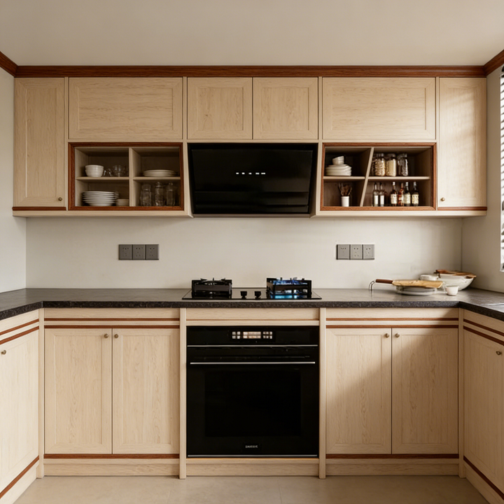 Cuisine moderne minimaliste en bois naturel Balom avec armoires en bois clair, détails de finition foncés et comptoir en forme de L