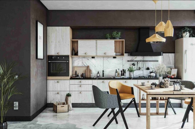 Cuisine en bois Balom, prête à assembler, armoires de cuisine, porte en PVC vert, armoires personnalisées avec éclairage LED