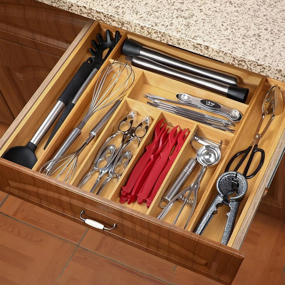 Organisateur de cuillères coulissant en bambou à 6-8 compartiments 45x43-30cm, supports de cuillères à clipser, écologique, compatible micro-ondes pour la cuisine