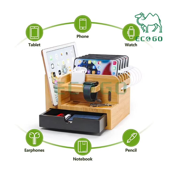 Support organisateur de support de station de charge en bambou avec tiroir à 5 fentes pour chargeurs de plusieurs appareils
