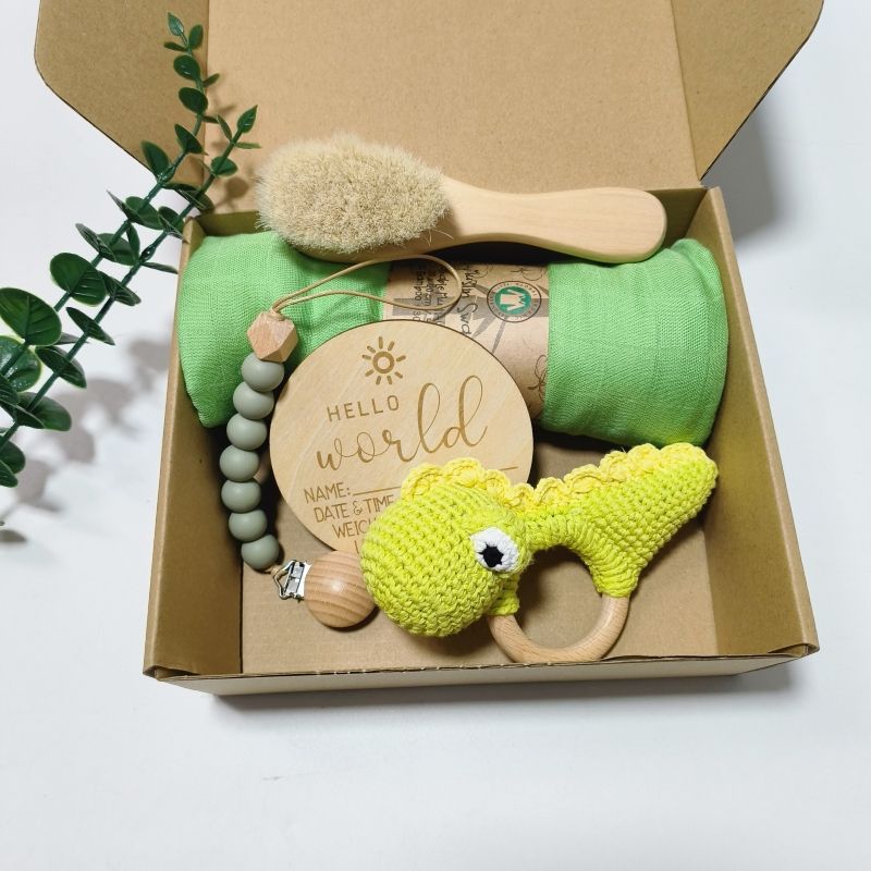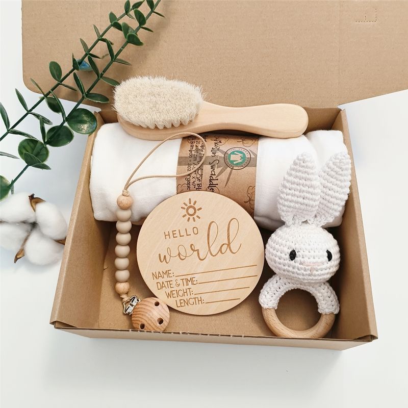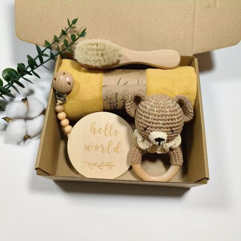 Product:Muslin Swaddle Blanket Baby Essentials Gift Set with Rattle Brush