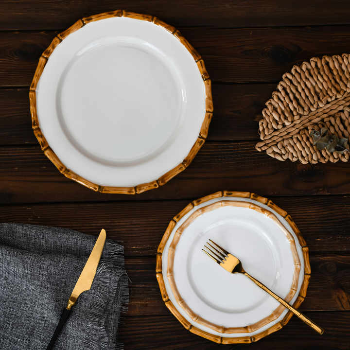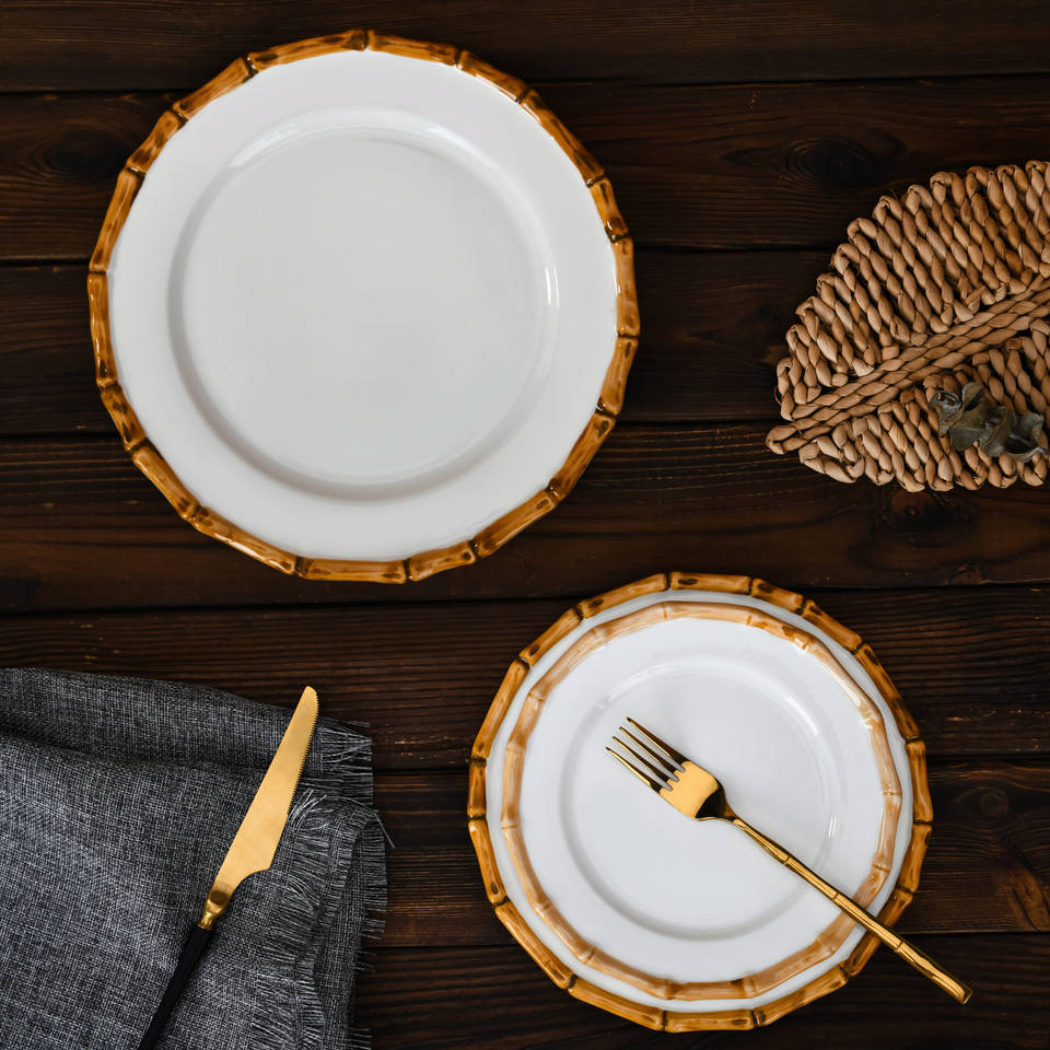 Assiettes à dîner en céramique de style rétro avec bord en bambou, en porcelaine blanche, ensembles d'assiettes et de bols pour mariage, vaisselle végétarienne