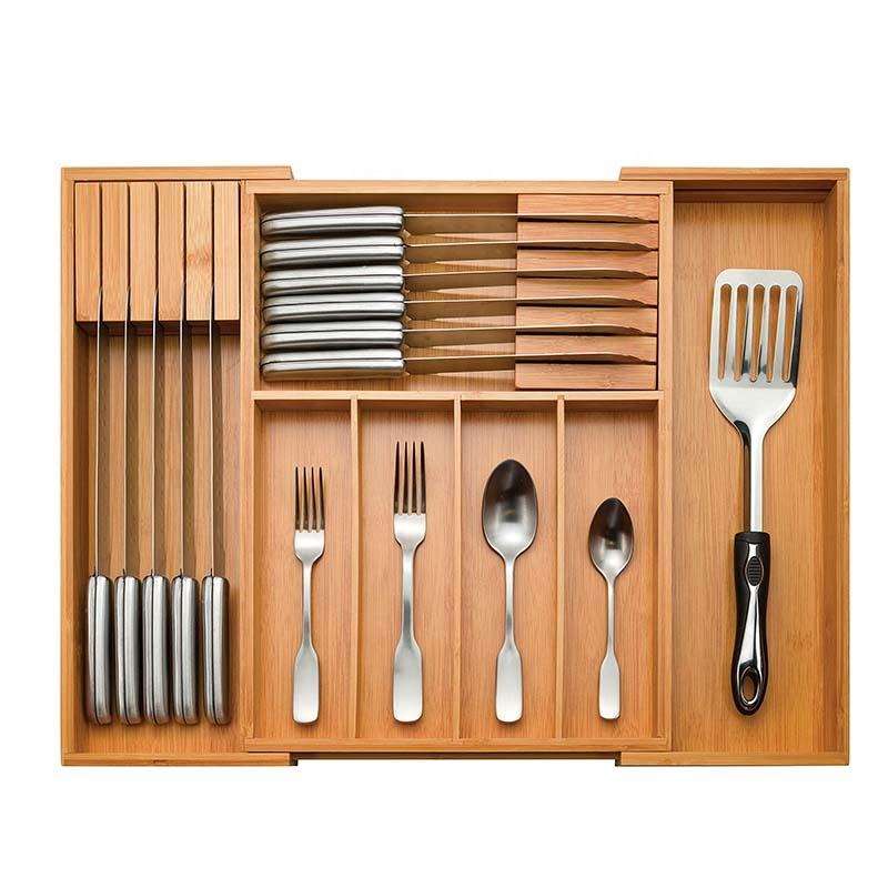 Boîte à couverts extensible en bambou, organisateur de tiroirs de cuisine, organisateur de couverts avec bloc à couteaux amovible, 7 compartiments