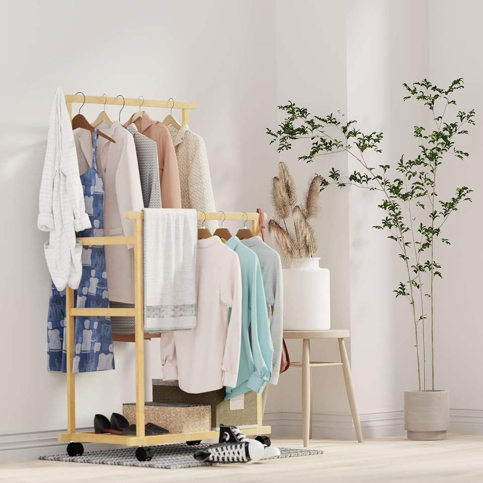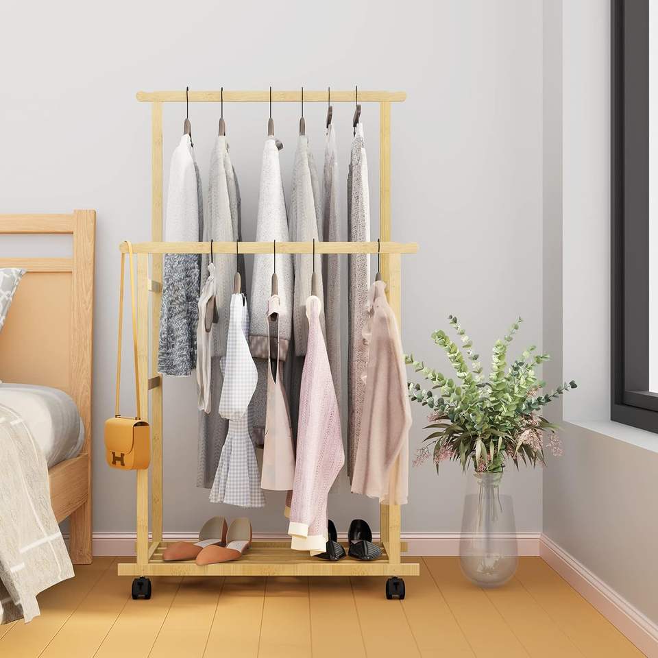 Porte-vêtements en bambou à double barre sur roulettes avec étagère inférieure pour le rangement des chaussures, organisateur de vêtements sur pied pour la chambre à coucher