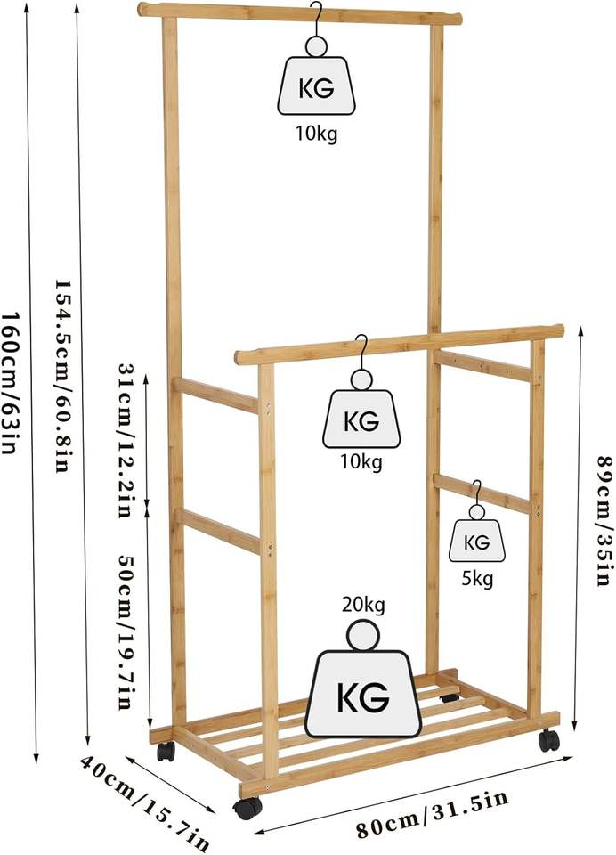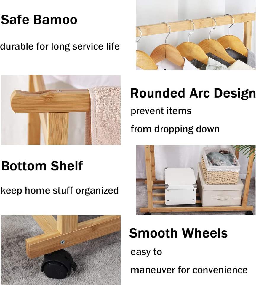 Nom du produit:Portant à vêtements en bambou à double barre sur roulettes avec base