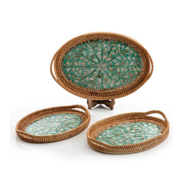 Ensemble de 3 plateaux de service en bambou et rotin avec incrustations de nacre, de différentes tailles, forme ovale, plateau à dessert à prix abordable