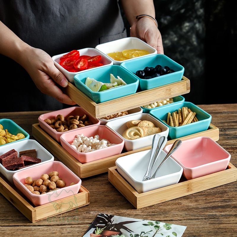 Ensemble de plateaux de service en bambou avec bols en céramique, finition laquée, personnalisé pour les restaurants et les fêtes, qualité domestique