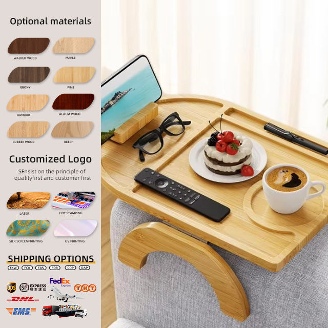 Table de canapé en bambou à clipser sur palette, accoudoir antidérapant avec support de téléphone portable rotatif à 360 degrés