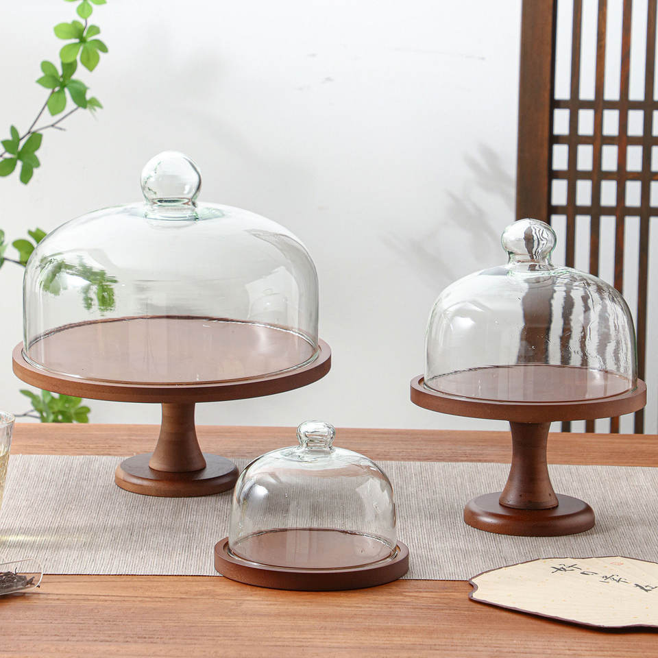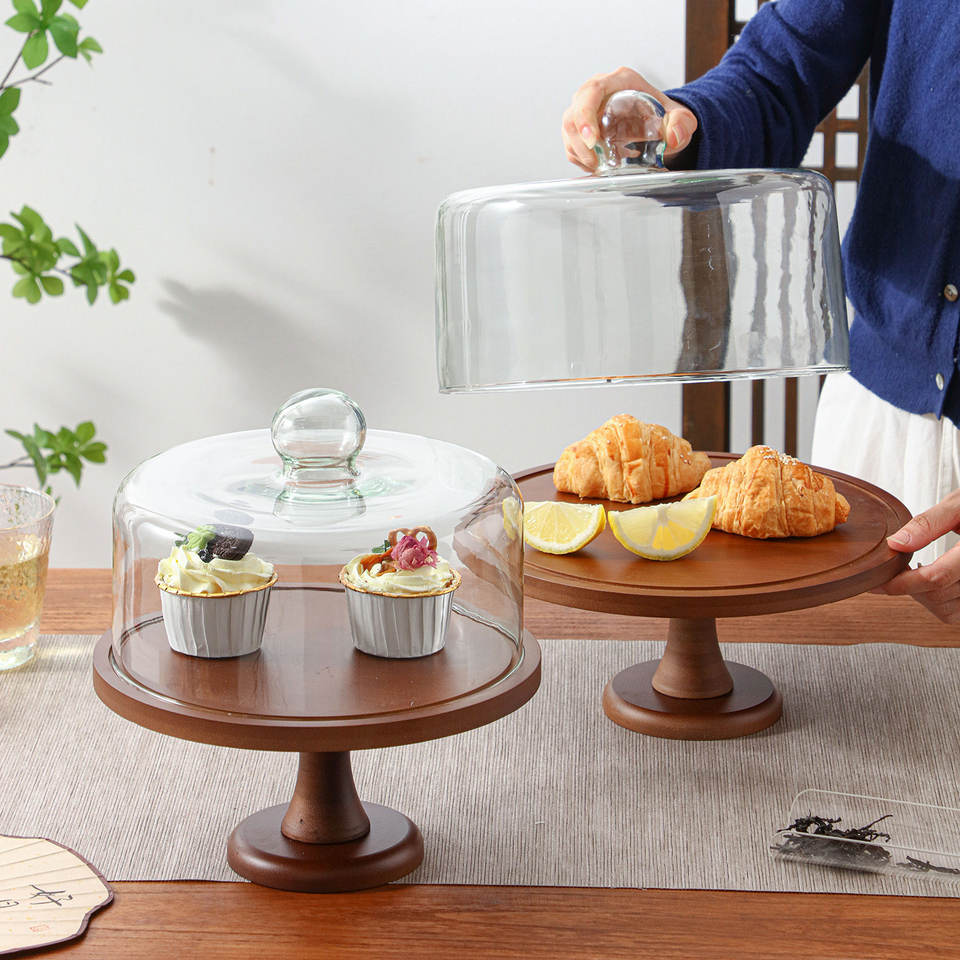 Plateau à gâteau rond haut en bambou avec couvercle en verre, présentoir à pâtisserie, présentoir commercial, plateau de présentation de desserts de haute valeur