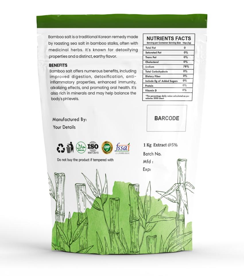 Main Ingredient:Bamboo Extract Infused during the roasting process adding unique minerals and enhancing the salt's properties. Minerals Potassium magnesium calcium and trace elements from the bamboo tube and sea salt.