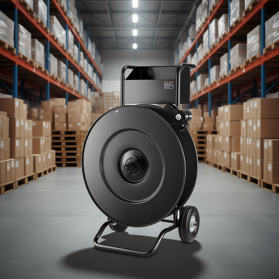 Chariot de cerclage pour bobines de 8 à 16 pouces, plateau spacieux et robuste pour la fixation de charges