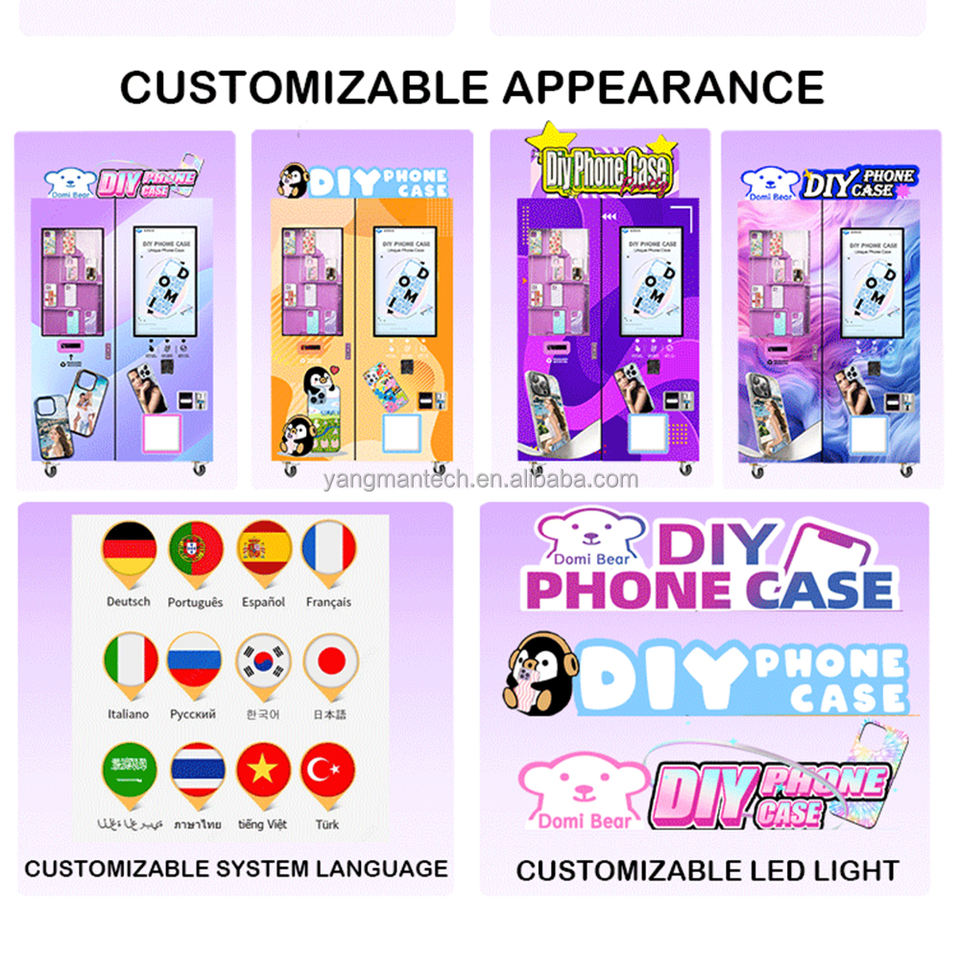 Distributeur automatique de coques de téléphone portable personnalisées, avec paiement par billets, disponible 24h/24, pour usage commercial