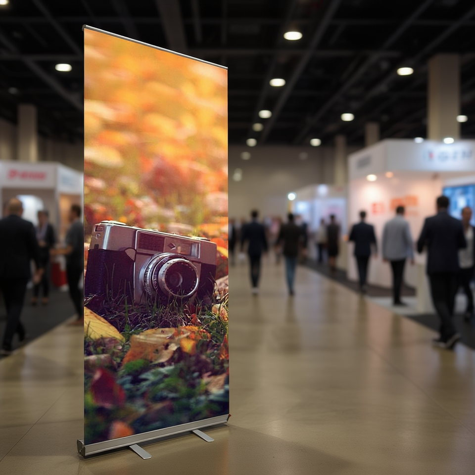 Support de bannière publicitaire 40x79 en métal et vinyle, portable, réutilisable, autoportant, argenté