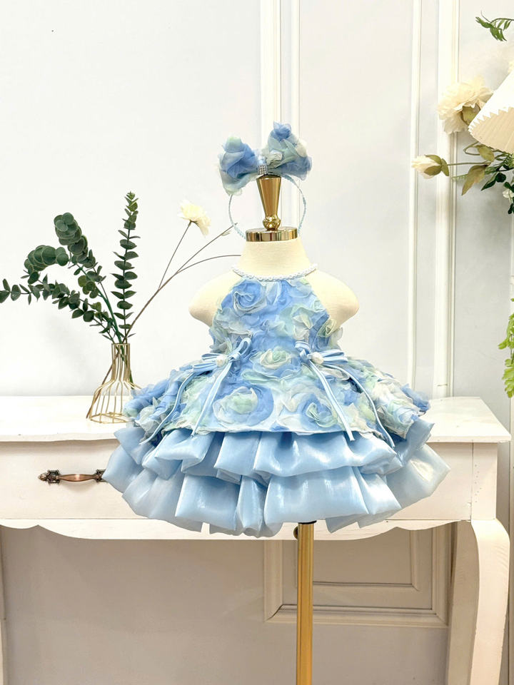 Robe de princesse Bao Tran COOL BLUE ROSE pour filles, respirante, écologique, en taffetas, maille, lin, design superposé, fleurs 3D, perles