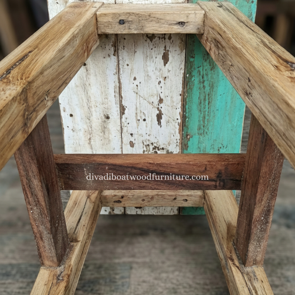 Tabouret de bar design en bois de bateau recyclé, original, unique, multicolore, artisanal, compact, pour l'intérieur et l'extérieur, exportation de meubles