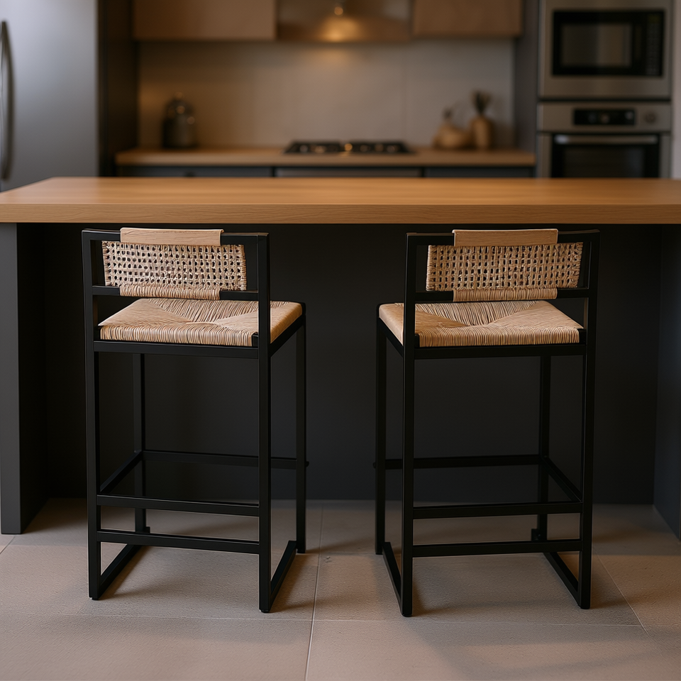 Ensemble de 2 tabourets de bar, cadre en métal, siège tissé, design moderne, pour la maison, le bar, la cuisine