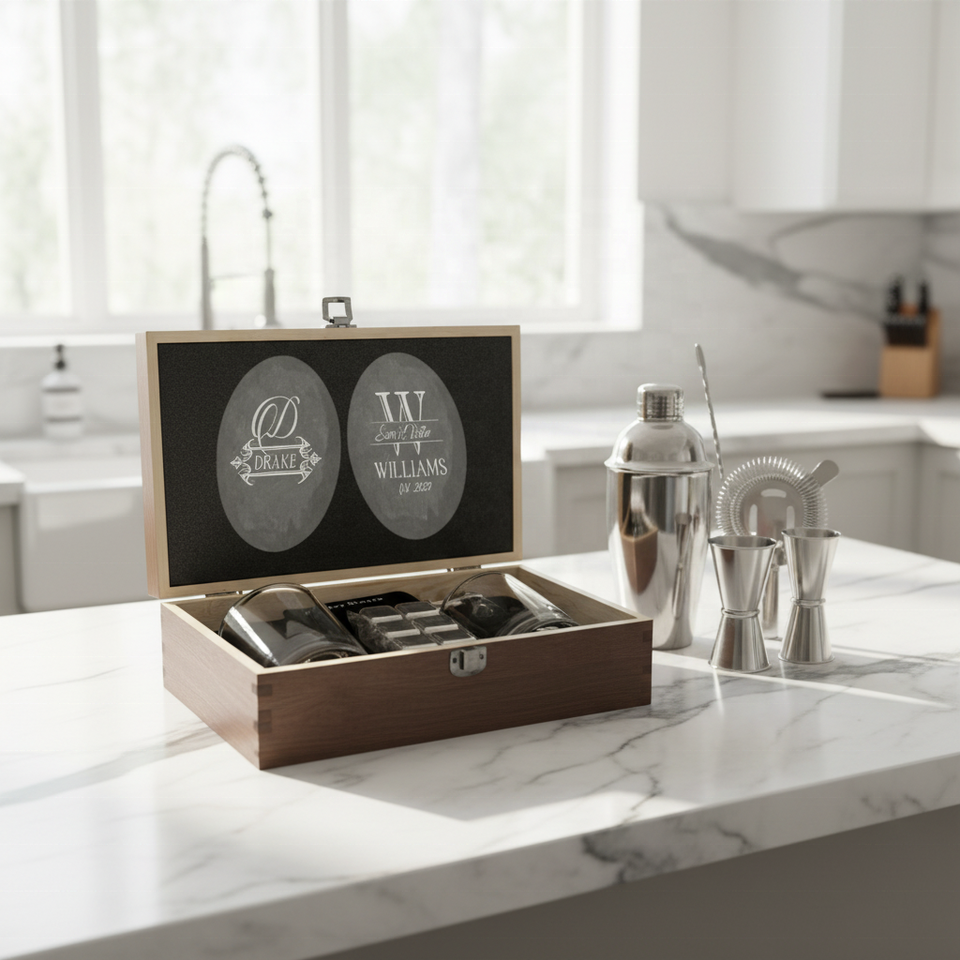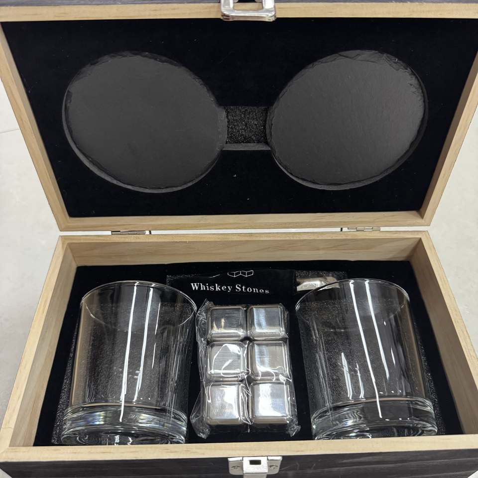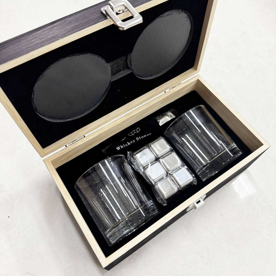 Ensemble de verres à whisky en bois avec logo personnalisé, boîte cadeau en bois, pince à glaçons et sous-verres pour dégustation de whisky