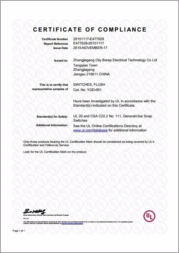 Nom du produit:Barep YGD-001 Modèle Américain 1 Gang 1 Way Interrupteur Mural