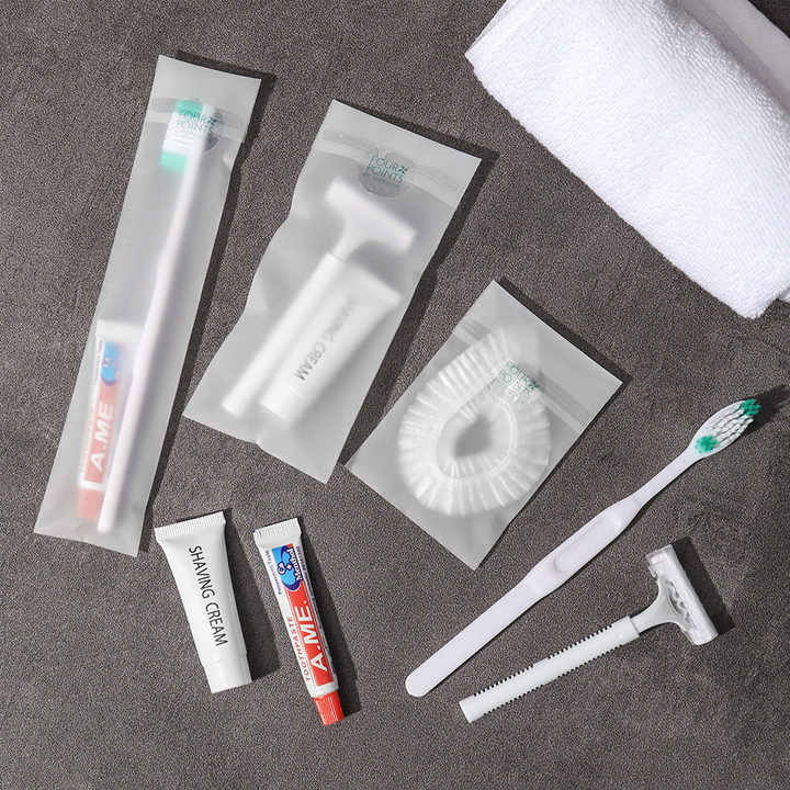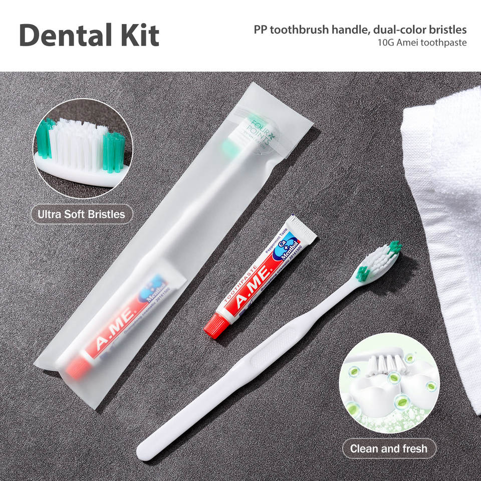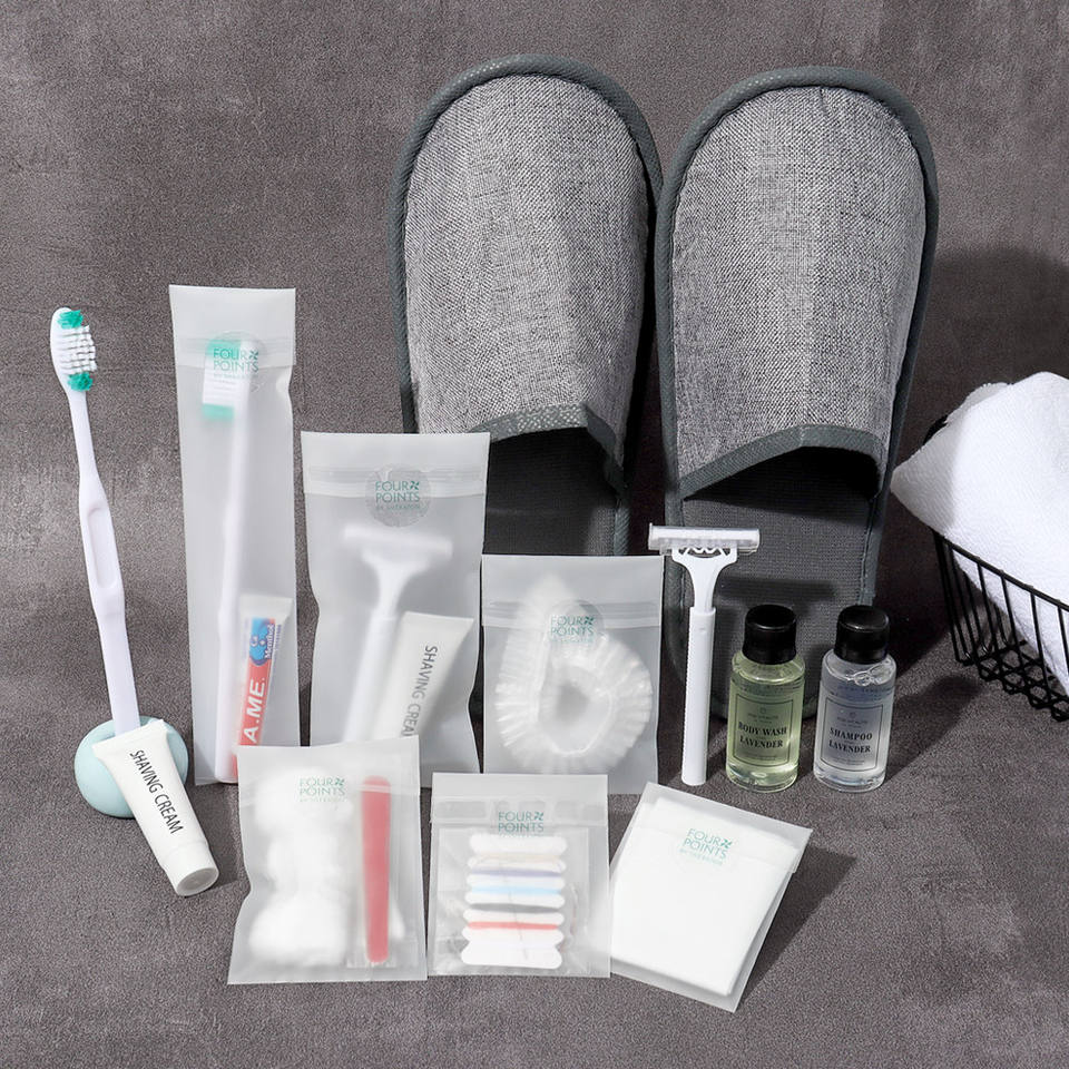 Kit d'articles de toilette jetables pour hôtel, le plus populaire, comprenant un kit de toilette miniature, un kit dentaire doux et des chaussons d'hôtel et de voyage