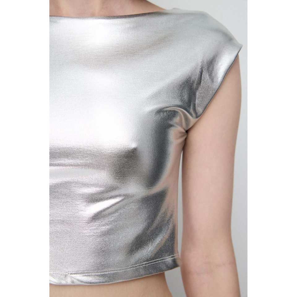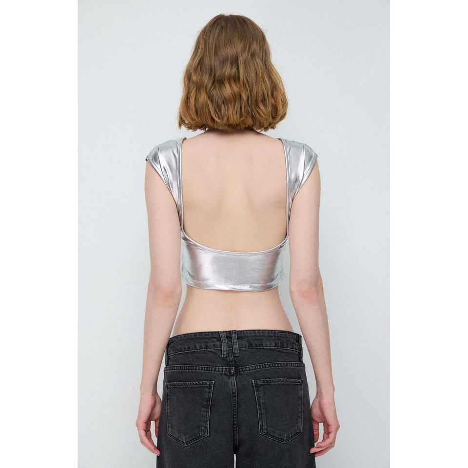 Basic Crop Top with Shiny Backless Casual Short Length Design Front Logo Placement