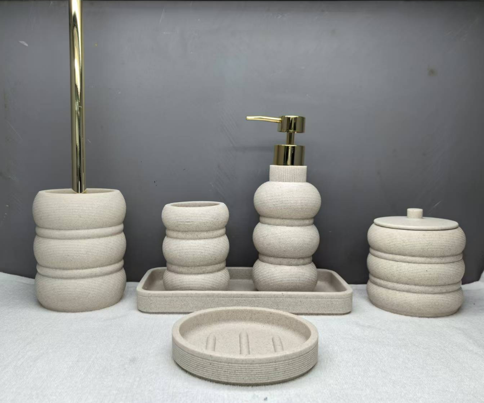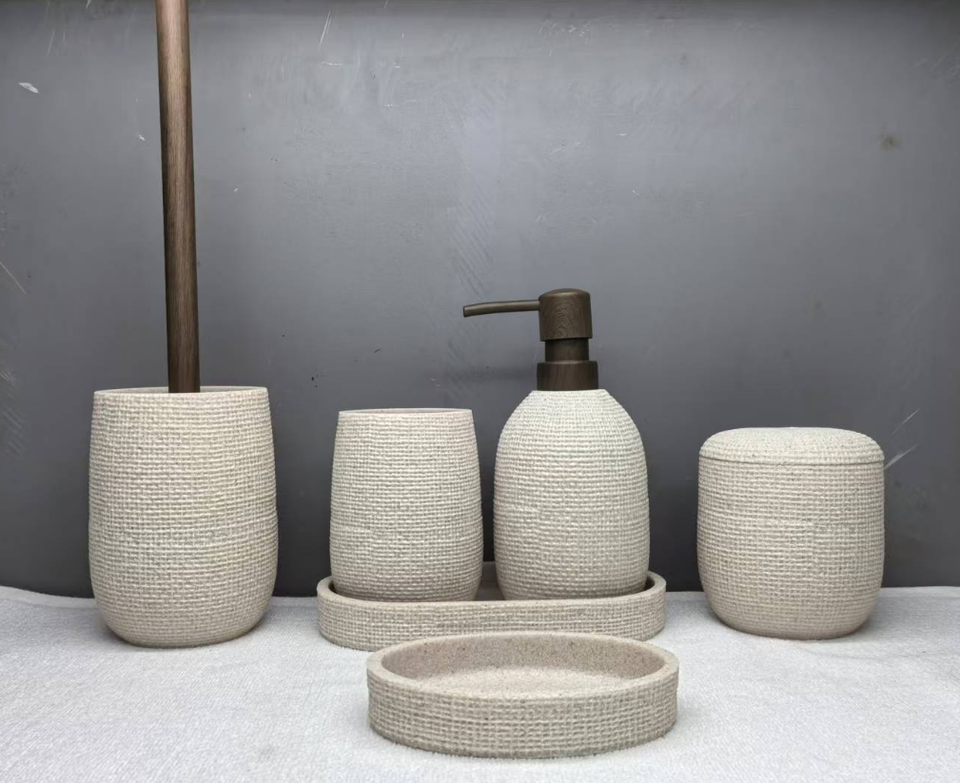 Ensemble d'accessoires de salle de bain en plastique avec poubelle, distributeur de savon, porte-savon, porte-brosse à dents et brosse WC avec support