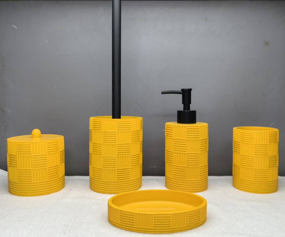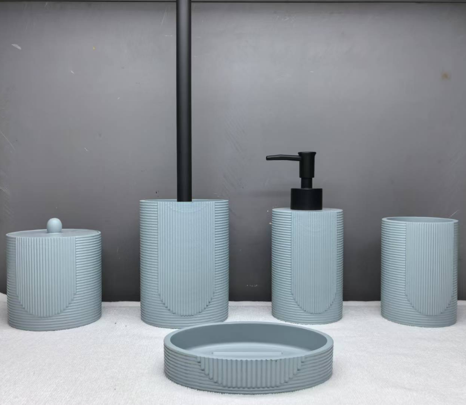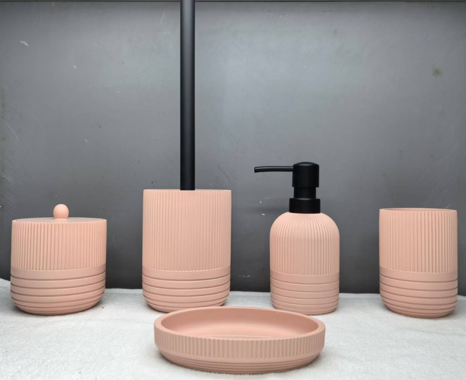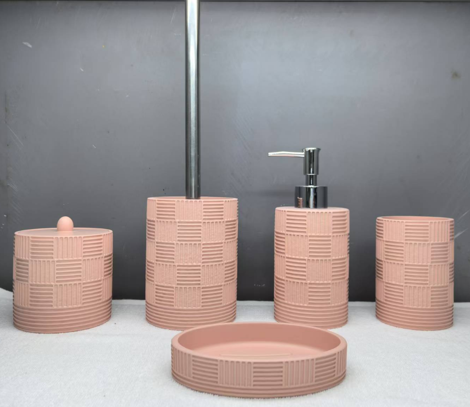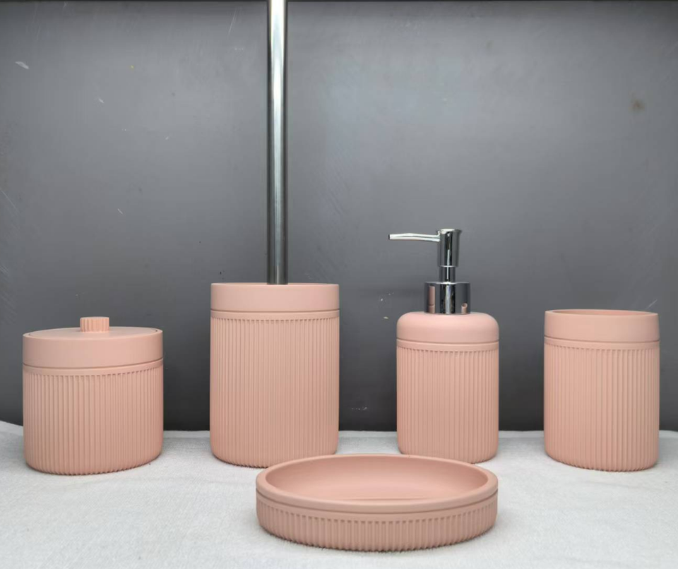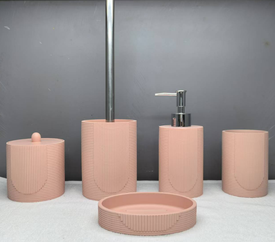 Ensemble d'accessoires de salle de bain en plastique avec poubelle, distributeur de savon, porte-savon, porte-brosse à dents et brosse WC avec support