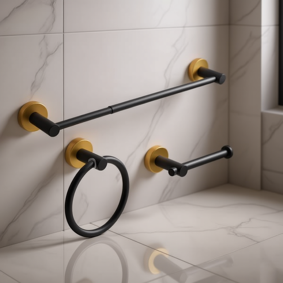 Ensemble d'accessoires de salle de bain 3 pièces, barre porte-serviettes réglable 16-27 pouces, finition noir et or, accessoires de salle de bain modernes à fixation murale